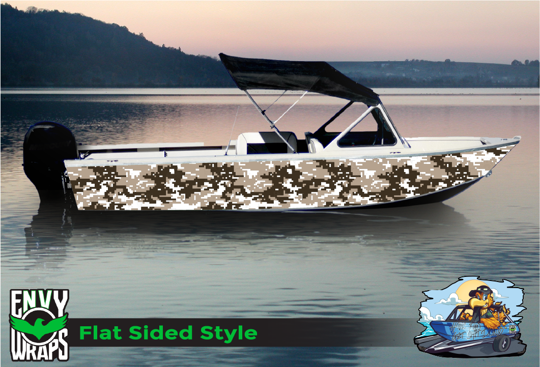 Pixel style camouflage is one of the more popular camo designs for wrapping boat hulls and light and dark shades of brown remains the classic coloring used for camouflaging. Our kit includes two printed sheets of vinyl sized to fit hull heights of 24" to 30" or 31" to 37" and can be purchased for flat sided hulls or rib ridges clinker style hulls. Printed finishes include your choice of 2.5 Mil Gloss or Matte finish you prefer your digital camo design to be printed on.