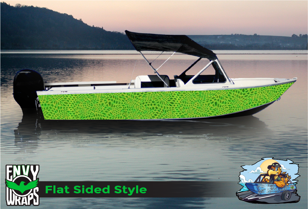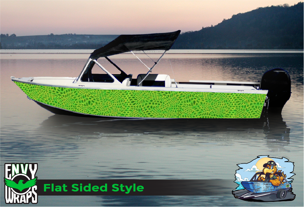 This Chartreuse Camouflaged hexagonally designed boat sides wrap includes two printed sheets of vinyl in available hull heights of 24" to 30" to 31" to 37" for both flat sided hulls or rib ridges clinker style hulls to fit your boat hull perfectly. Vinyl finishes include your choice of 2.5 Mil Gloss or Matte finish you prefer your camo design to be printed on.