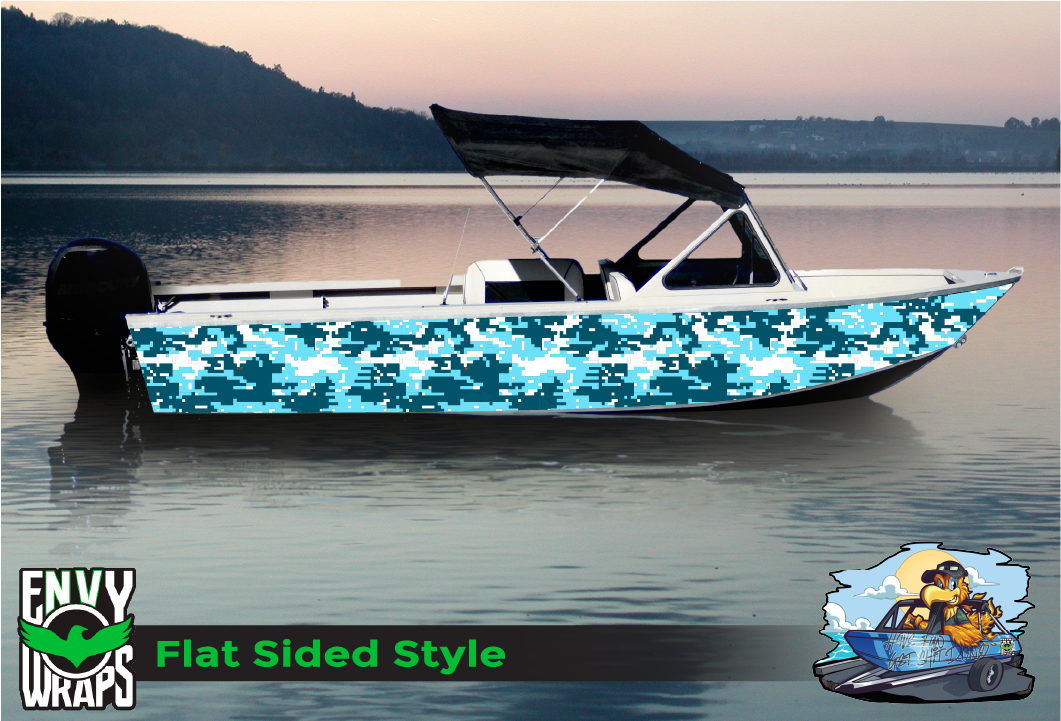 Pixel style camouflage is one of the more popular camo designs for wrapping boat hulls and this light blue, darker blue camo look is an excellent collage of colors for blending on the water on a brightly lit day. Our kit includes two printed sheets of vinyl sized to fit hull heights of 24" to 30" or 31" to 37" and can be purchased for flat sided hulls or rib ridges clinker style hulls. Printed finishes include your choice of 2.5 Mil Gloss or Matte finish you prefer your digital camo design to be printed on.