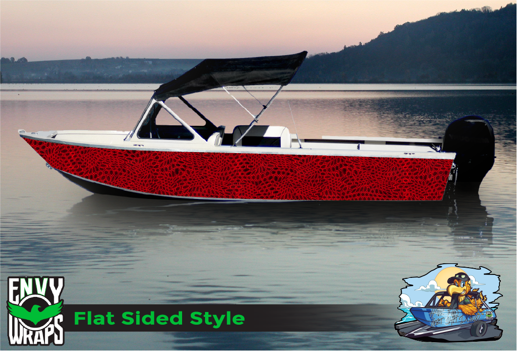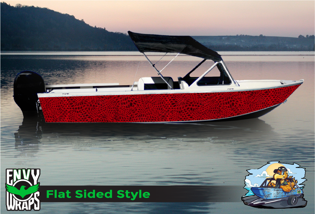 This Red Camouflaged hexagonally designed boat sides wrap includes two printed sheets of vinyl in available hull heights of 24" to 30" to 31" to 37" for both flat sided hulls or rib ridges clinker style hulls to fit your boat's hull perfectly. Vinyl finishes include your choice of 2.5 Mil Gloss or Matte finish you prefer your camo design to be printed on.