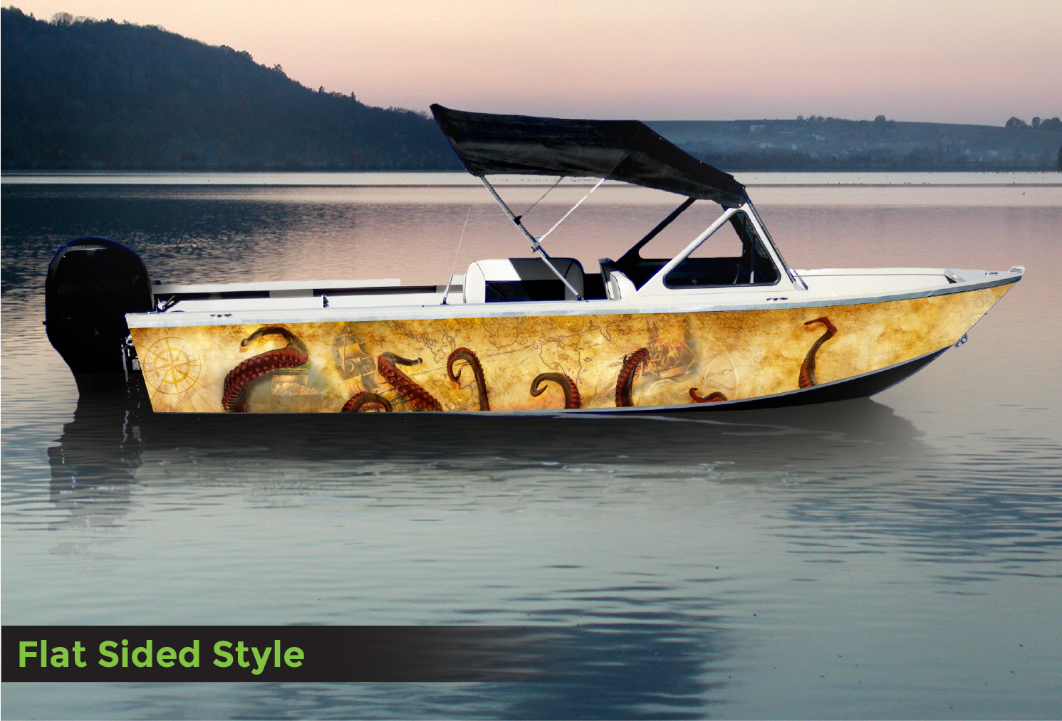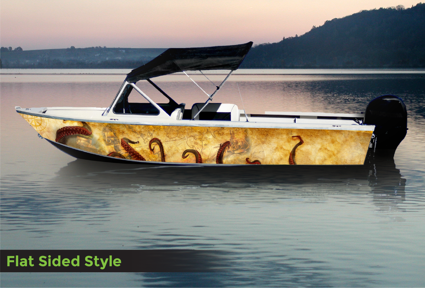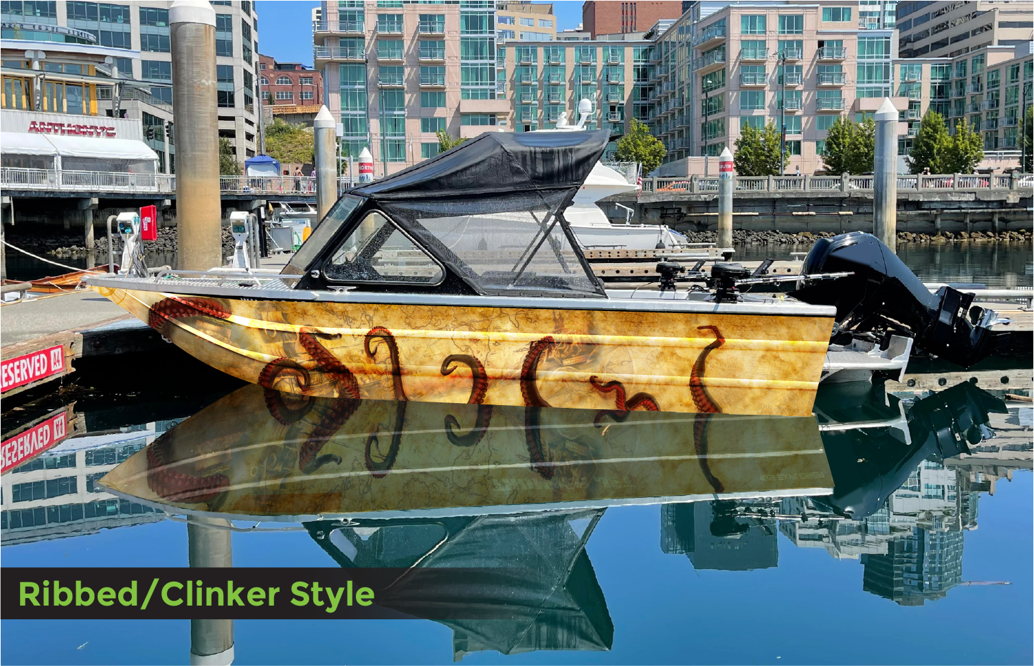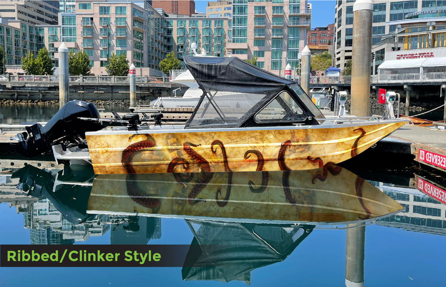 Price will vary between flat side vs ribs/ridges/clinker style. Please review our Hull Style page to help determine which style your boat is. Flat side wraps wont contour into recessed areas without air bubbles if installed on any surface that is NOT flat.